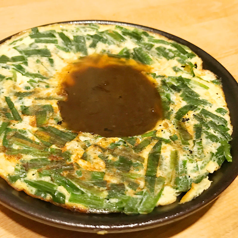 この前焦がしたニラ卵のリベンジ。ドーナツ状に焼いて