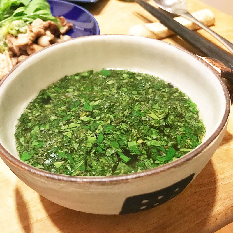 モロヘイヤの葉を粘りが出るまで叩いてチキンスープに。