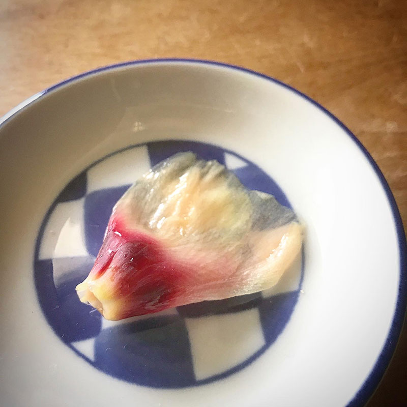 朝、仕込んでおいたオクラの花の甘酢漬け。シャキシャキした歯応えが美味しい。花も実と同じようにぬめりがあるのが面白い。