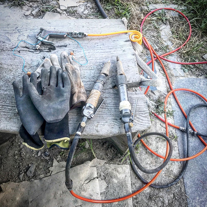 圧縮空気で動くノミで一日中、白御影石の小品を彫った。