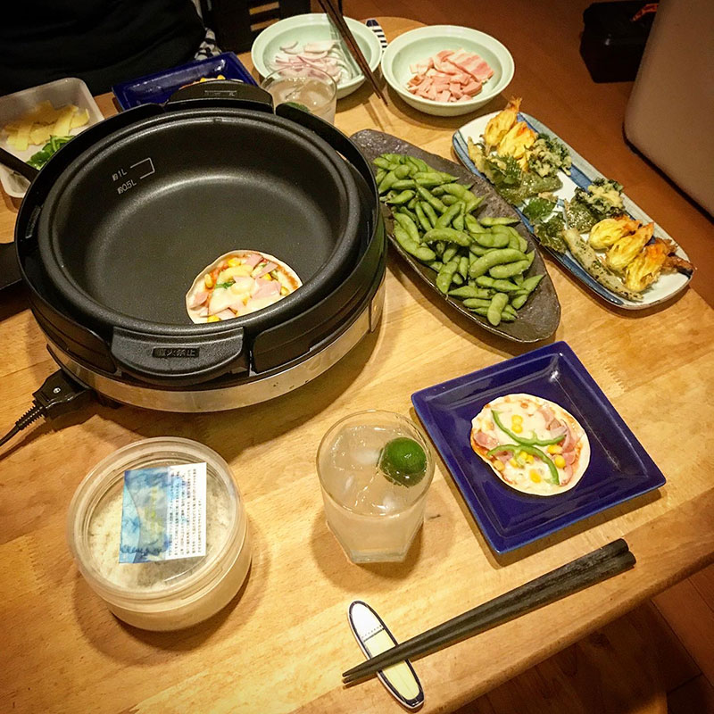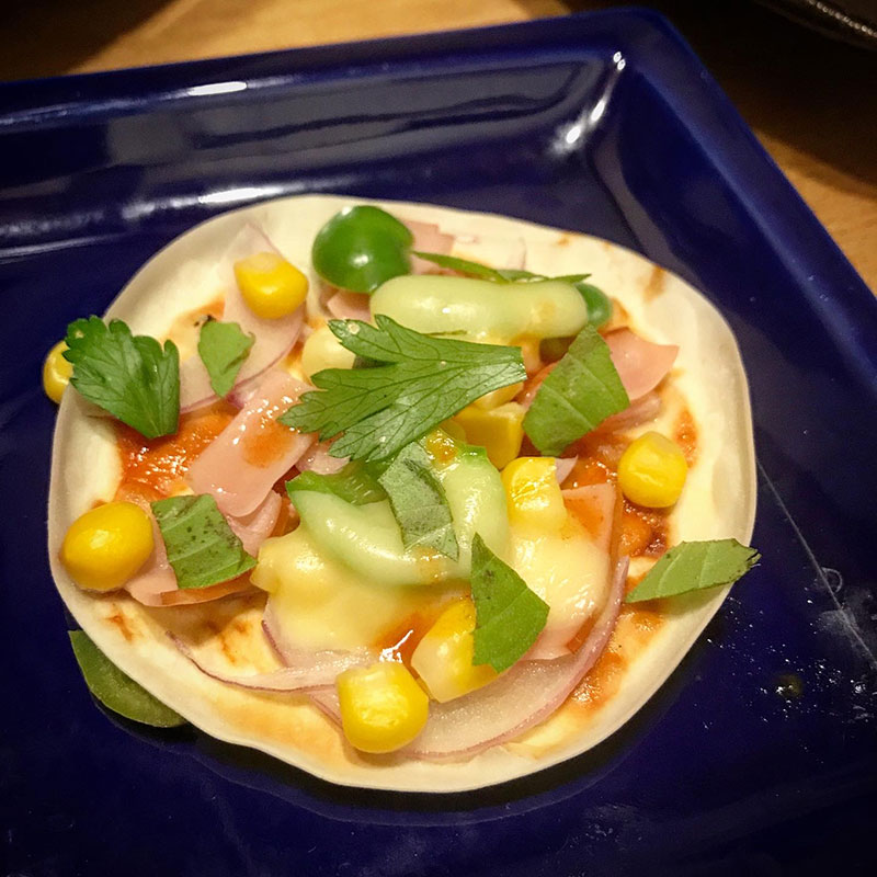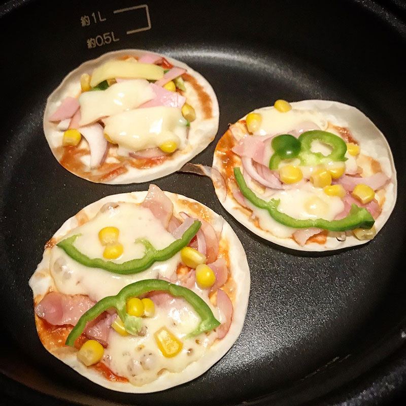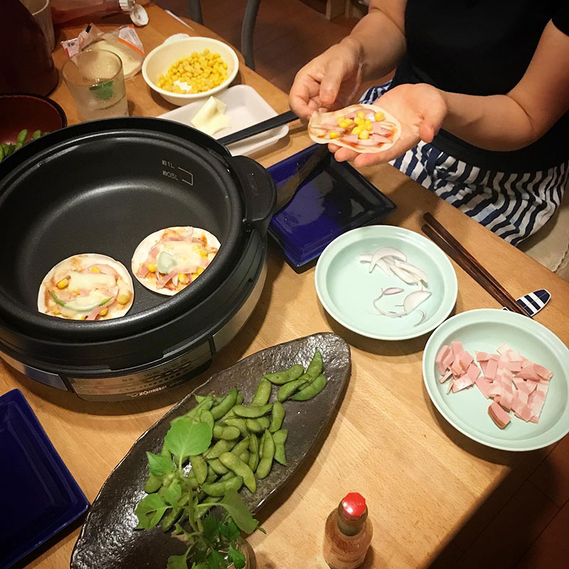 今宵は餃子の皮のピザパーティー。このちょっとジャンクなピザはていねいに作った自家製のトマトソースよりケチャップの方が美味しいという不思議。