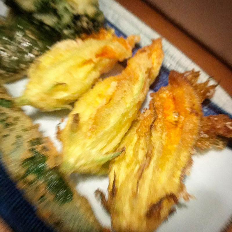今宵はパスタ手打ちするために買ってあるデュラムセモリナ粉を揚げ衣にした。サクサク美味しい。一株しかないのにぐんぐん育って花もいっぱい咲いて、この夏続けて作ったのでズッキーニの花びらを出来るだけ壊さずにおしべをとってチーズを詰めるの上手になって今日は油にチーズ溶け出さなかった。イエイ!