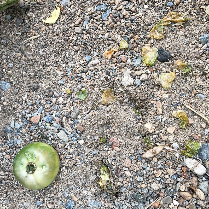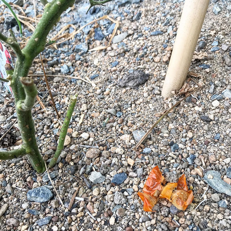 ミニトマトの赤い皮も散らばってる。くそう、多分カラスだな。