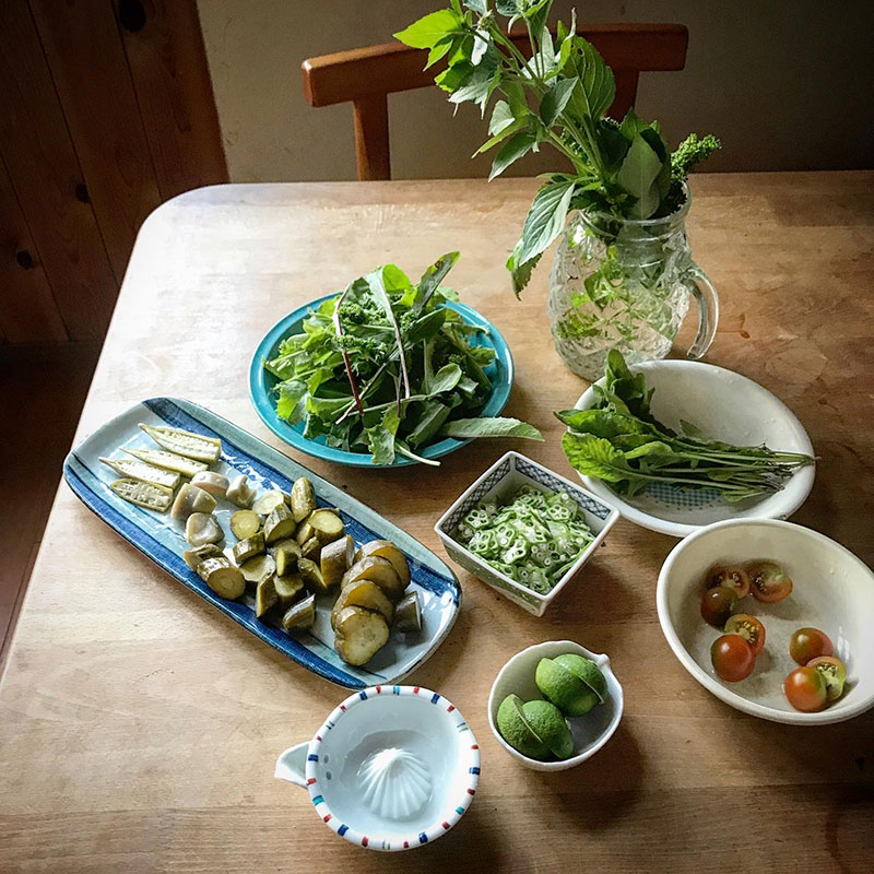#庭の猫の額畑 からミニトマトや葉物を中心に収穫。