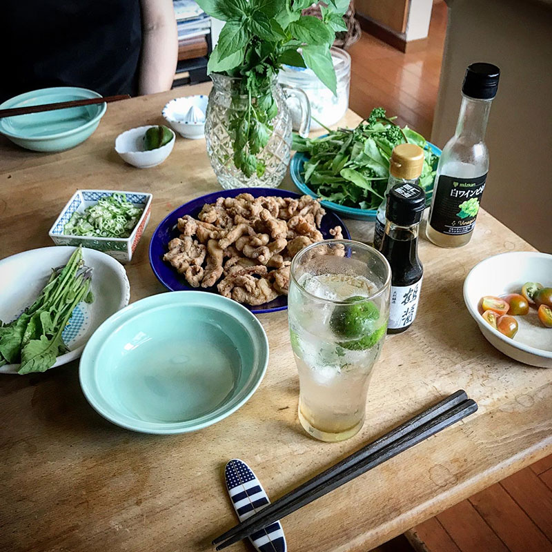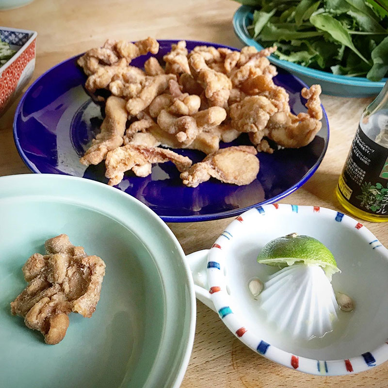 居酒屋我家、開店。カミさんが鳥のもも肉の薄切りで唐揚げ作ってくれた。