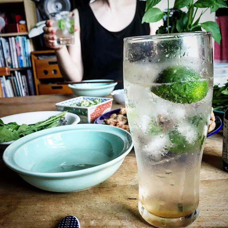 畑のミントと友だちがくれたすだちとバカルディラムのモヒートで乾杯。