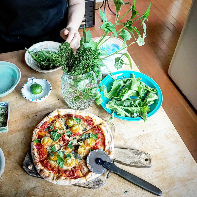 市販のピザに畑のミニトマトやレモンバジル乗せて焼き上がったら更にバジル。