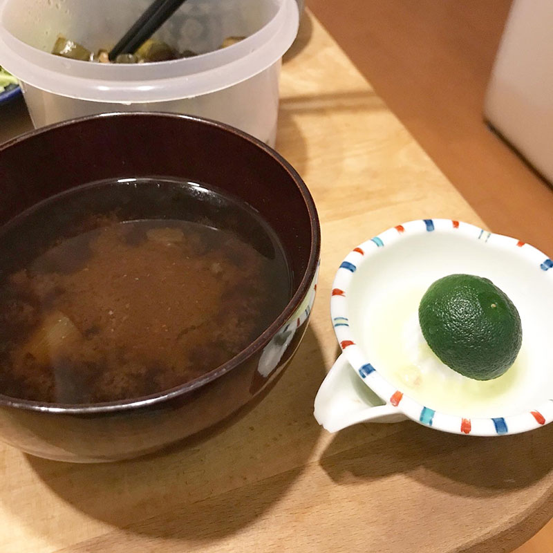 赤だし味噌汁にすだち。