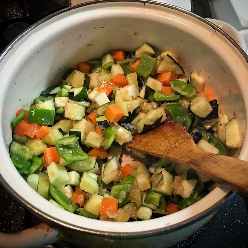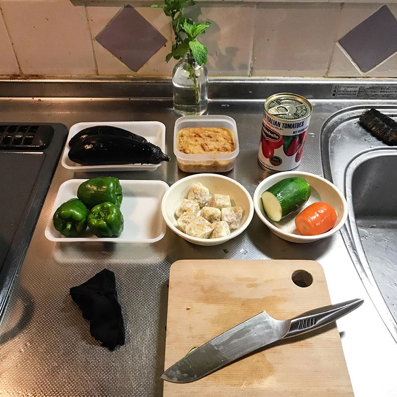 近所の方にいただいた茄子が食べきれない。冷蔵庫に傷みそうなズッキーニもあるのでラタトゥイユ仕込む。