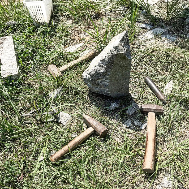 ちょっと危険な暑さだ。気をつけないと太陽の熱で金属のノミとか道具が熱い。全身から汗が吹き出してる。