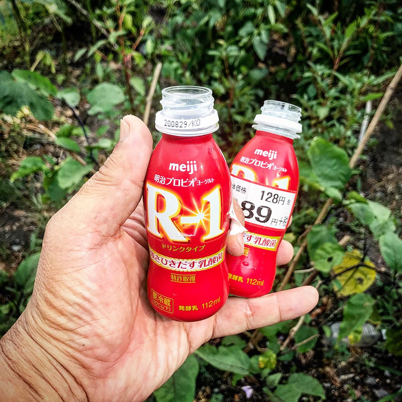 R-1飲んだ後の容器に水を入れて残った菌を混ぜて畑に。