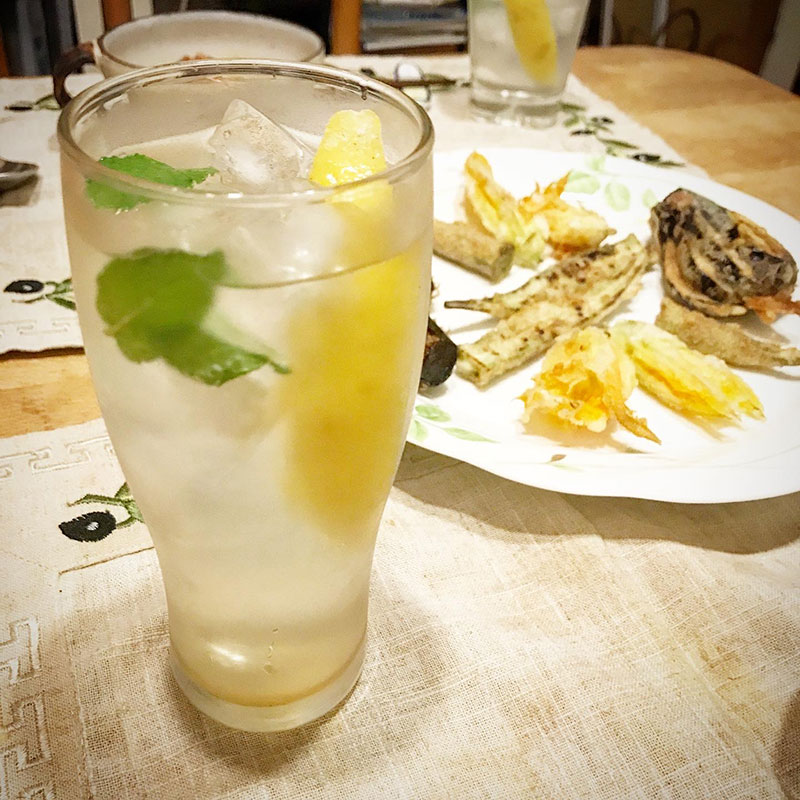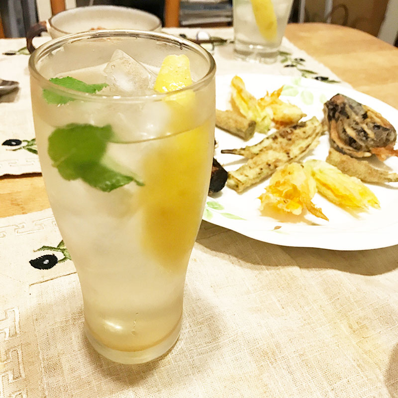 砂糖を蜂蜜に変えて畑のミントとバカルディのラムでモヒート。友だちにもらって冷凍してあった広島のレモン。