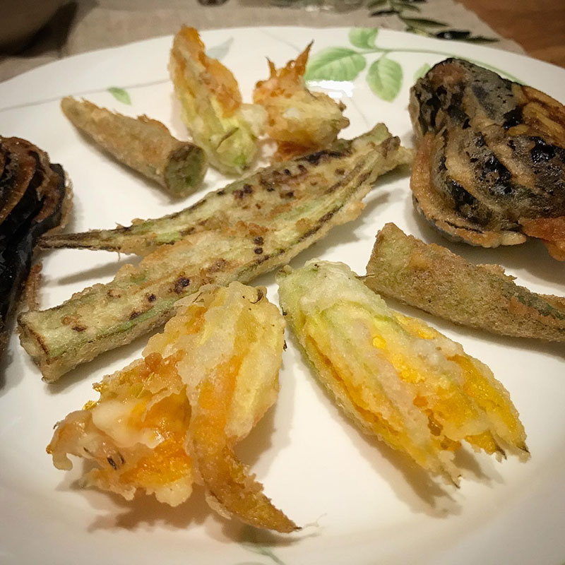 またズッキーニの花にチーズを詰めてフリットに。畑のオクラと茄子も。揚げ物や天ぷらは苦手だと思ってカミさんを頼りにしてたんだけど、よく考えたら自家製ポテトチップスの研究歴は30年以上だった。その油の中で素材から出る泡を見る感じは一緒だった。なんか天ぷら極めたくなってきた。