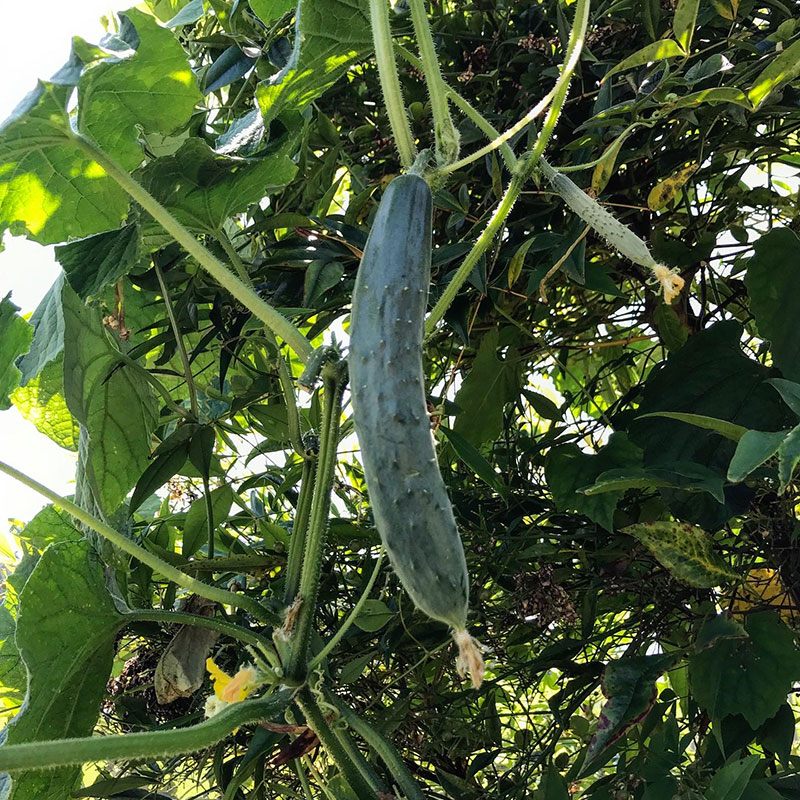 きゅうり棚を超えて伸びる蔓を隣の南天の木に誘引したので、南天の木にきゅうりがぶら下がってる。