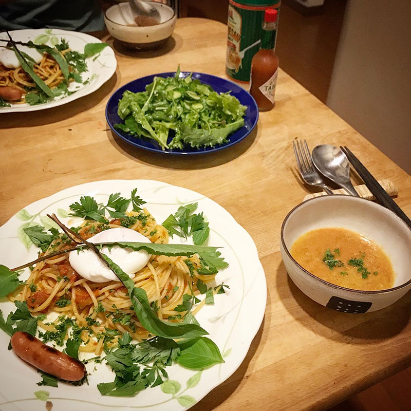 パスタには畑のパセリとイタリアンパセリ山の様に散らして。赤いチコリの葉と