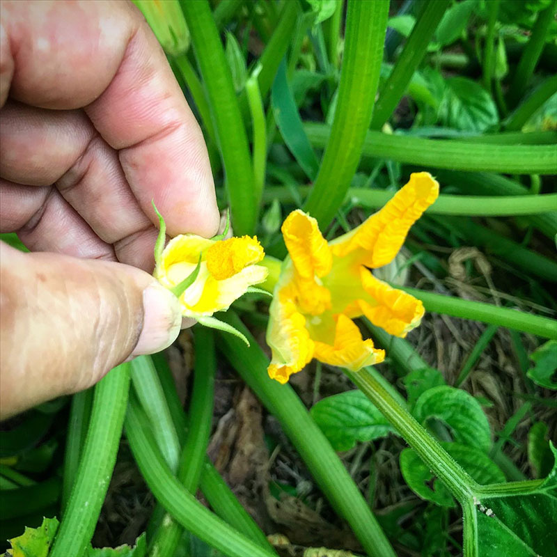 今朝、ズッキーニの雌花がまたひとつ咲いたので人工授粉。
