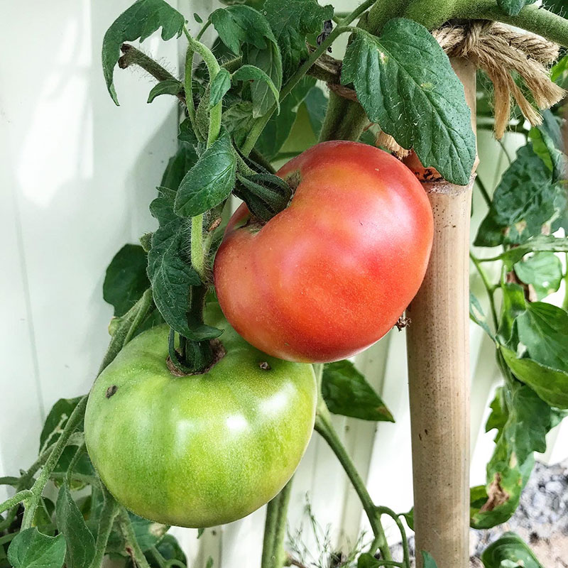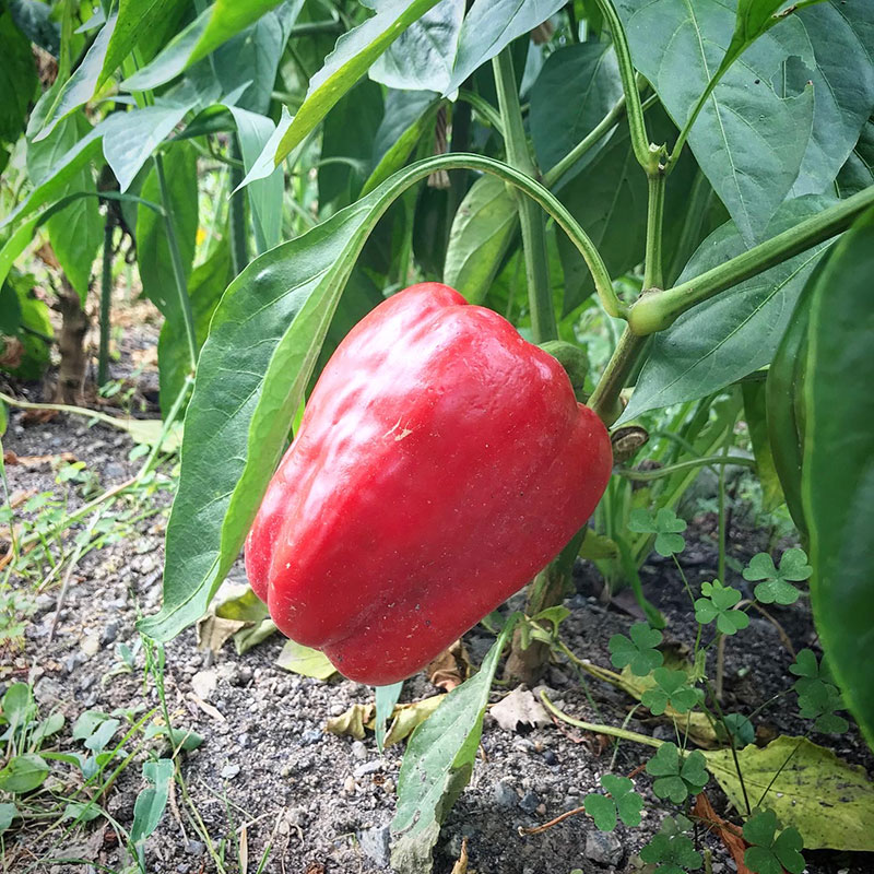 ミニトマトばかり赤くなっていた畑の大玉トマト、とうとう昼に収穫!ふたつめの大きなパプリカも。