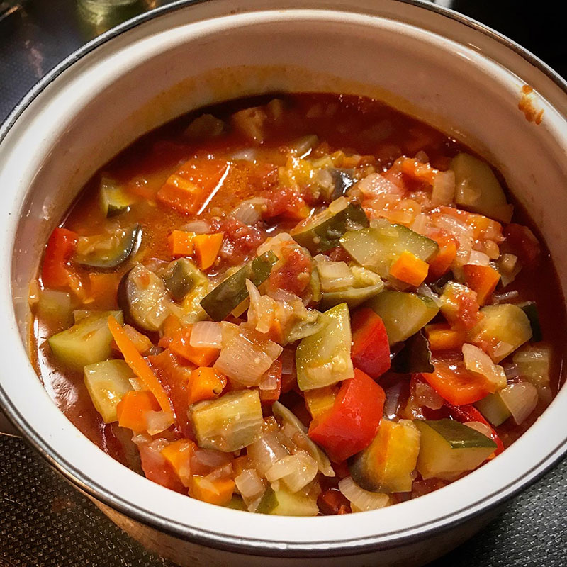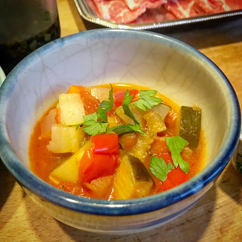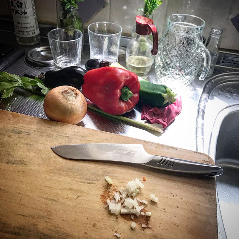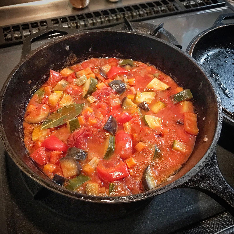 昼飯の後、庭の畑の野菜でラタトゥイユ作った。ロッジのスキレットで野菜の水分も逃さずに。本当なら20分煮込んだら別の鍋に移してスキレットのメンテナンスするべきなのはわかっていたのだけど午後の仕事に行くのが遅くなってしまうのでそれは夕方に回した。