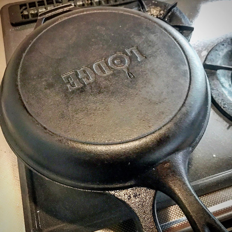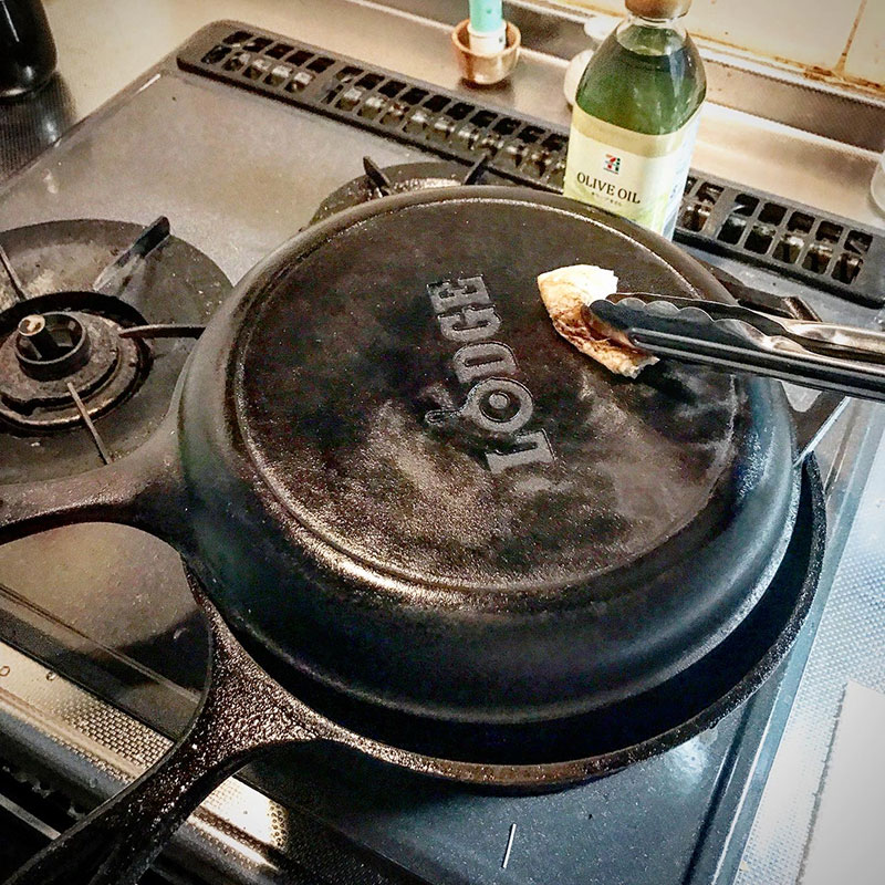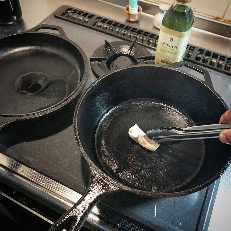 良く焼いたスキレットには表も裏もていねいにオリーブオイル塗ってメンテナンス終了。