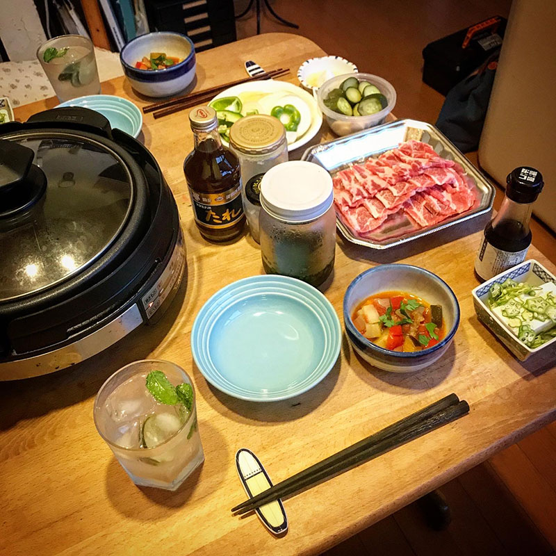 居酒屋我家、開店。ホットプレートで豚肉や野菜の焼き物。