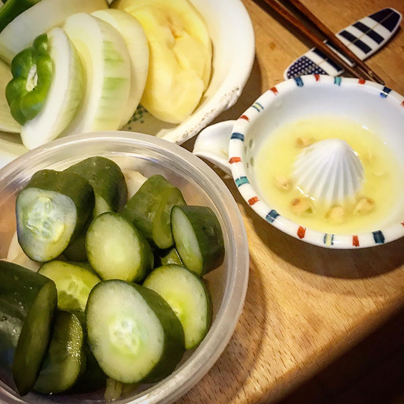 きゅうりのぬか漬け。今日もすだちのカクテル、ふたりともおかわり。