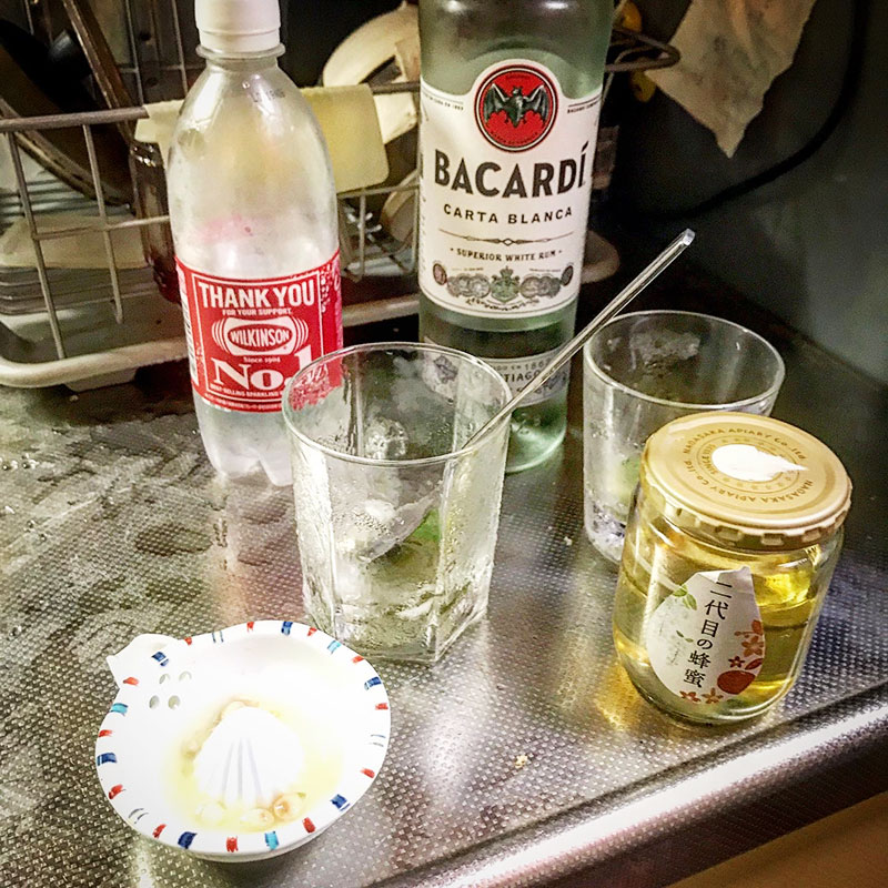 蜂蜜は氷があると固くなってしまうので常温でスプーン一杯をバカルディラムとよく混ぜてミントの葉を叩いて数枚。炭酸水を入れてそっとかき回したら氷を入れて出来上がり。先に氷を入れてしまうと混ざりにくいのと炭酸が抜けてしまうので通常とは順番がかなり違うけどこれが良いみたい。少しずつ美味しさが増してる。乾杯!
