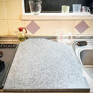 と言う事でぴったり収まる麺打ち用のプレートを石で作った。厚さ2cmの白御影石の板を45×61cmにカット。六角形なのはそれしか端材がなかったからです(苦笑)。
