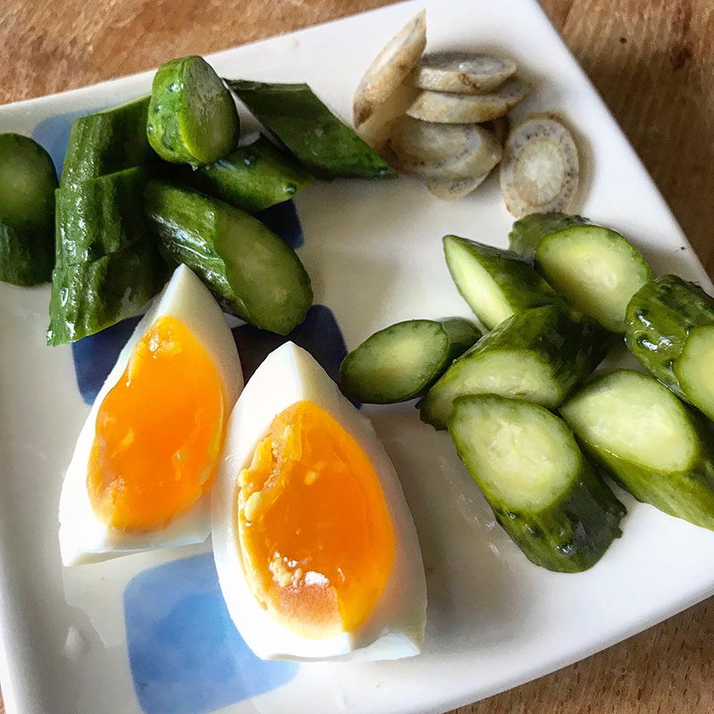 漬けて4日目の半熟ゆで卵のぬか漬け。チーズの風味のような濃厚さ。美味しい。深漬けのごぼう。2日目と3日目のきゅうりのぬか漬け味比べ。