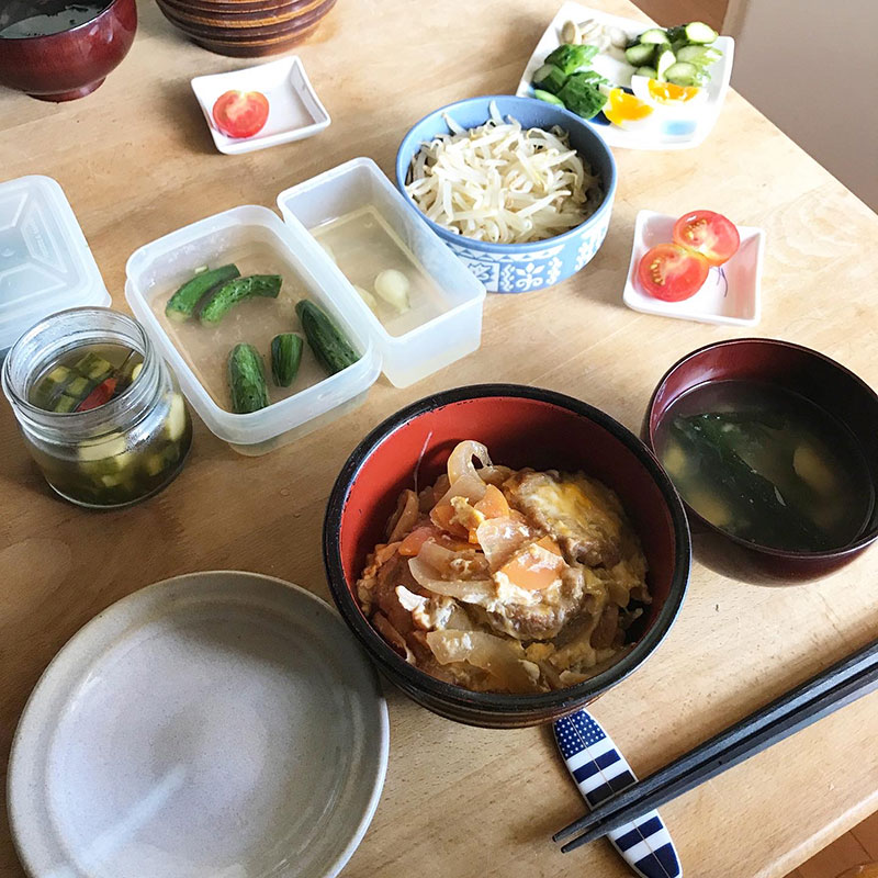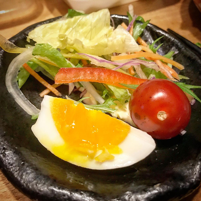サラダに混ざって並んでる半熟ゆで卵はぬか漬け。