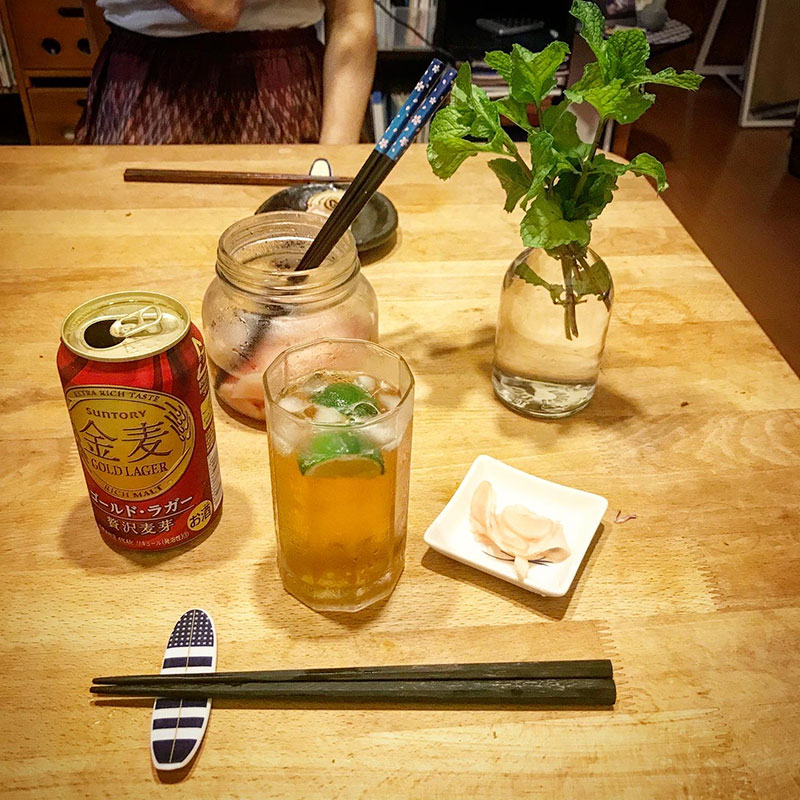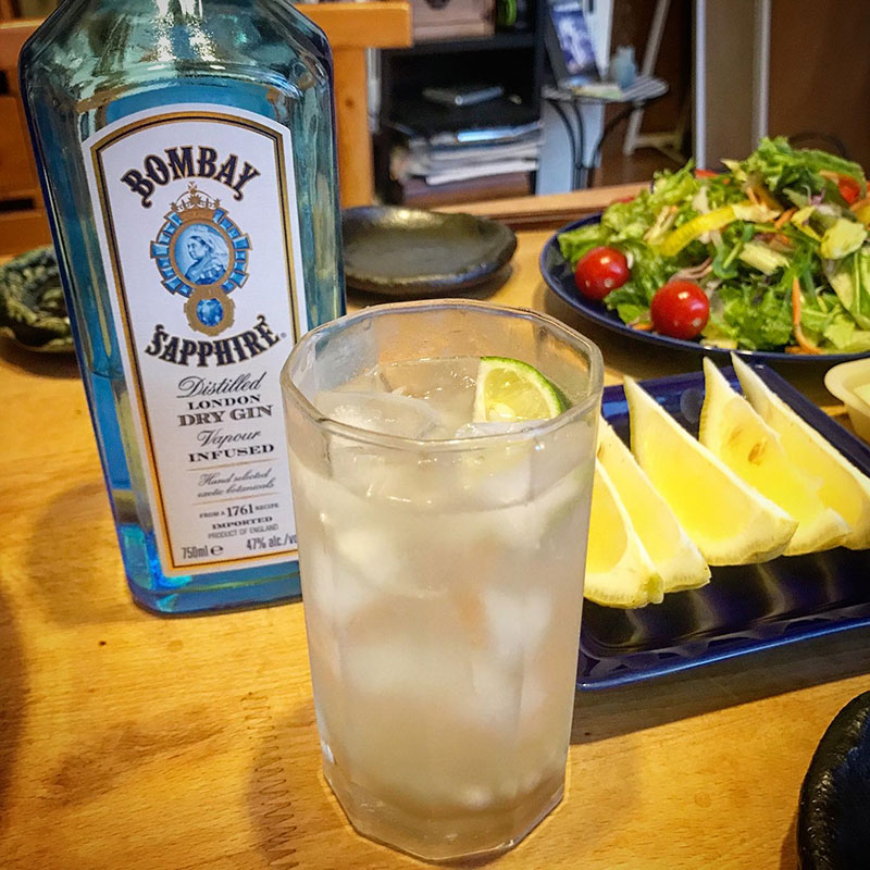 久しぶりの晴れにモヒート飲もうと思って庭のミントを摘んだら友だちから徳島のすだちが届いてたのでボンベイ・サファイヤジンを炭酸で割ってすだちを3つ絞った・幸