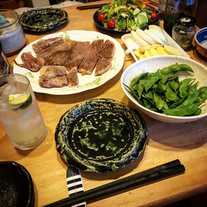うまー。すだちがある食卓の幸せな事。新生姜の甘酢漬けで肉の油をリセット。