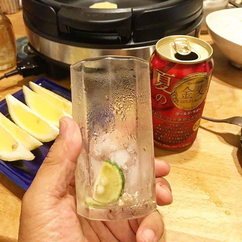 それを飲み終わったら金麦を注いで更にすだちを絞ってすだち入りのビールに。
