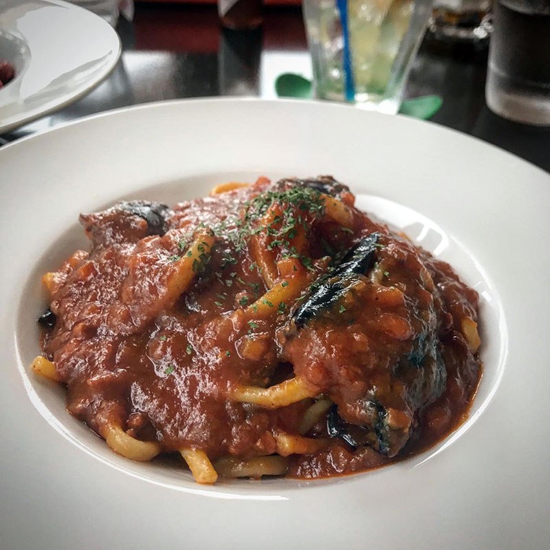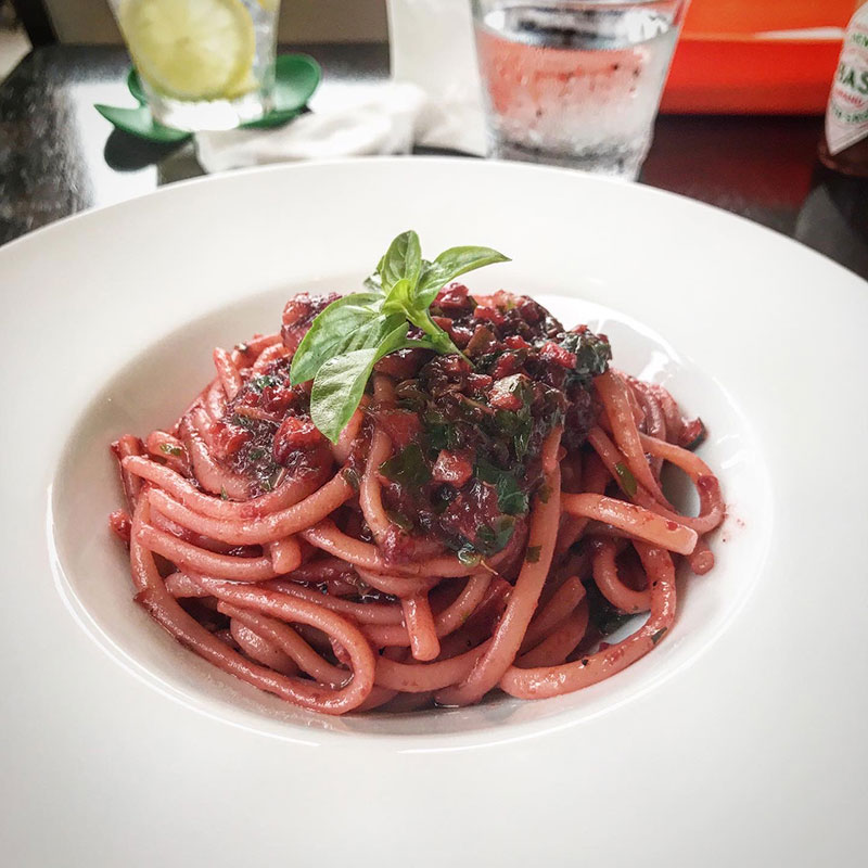 カミさんはビーツとバジルの生パスタ。橙の生パスタの歯応え最高なんである。
