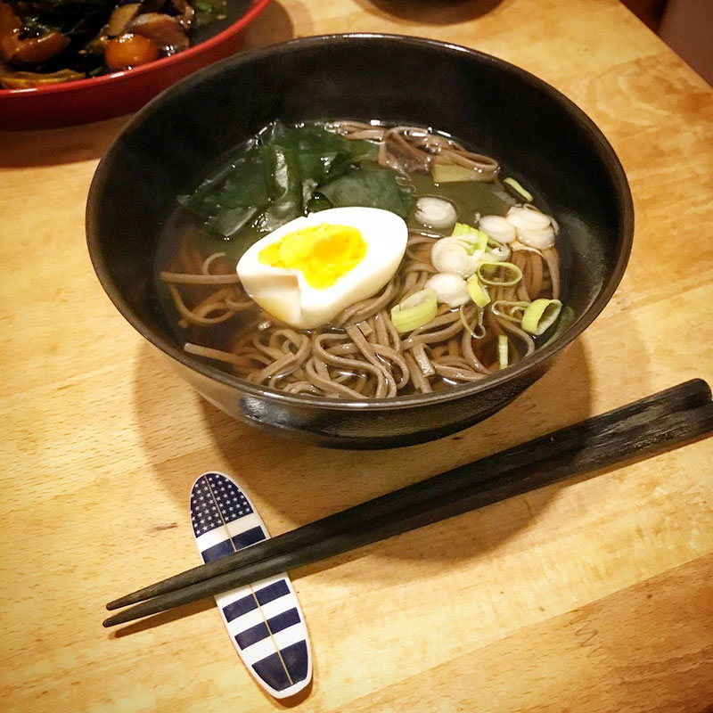 幼なじみにもらった美味しい出汁と作り置きのかえしでつゆを作ってワカメとネギと麺を茹でるついでに卵も茹でて。