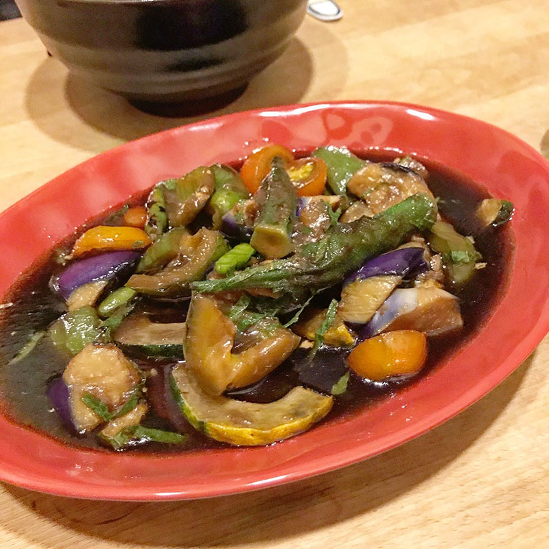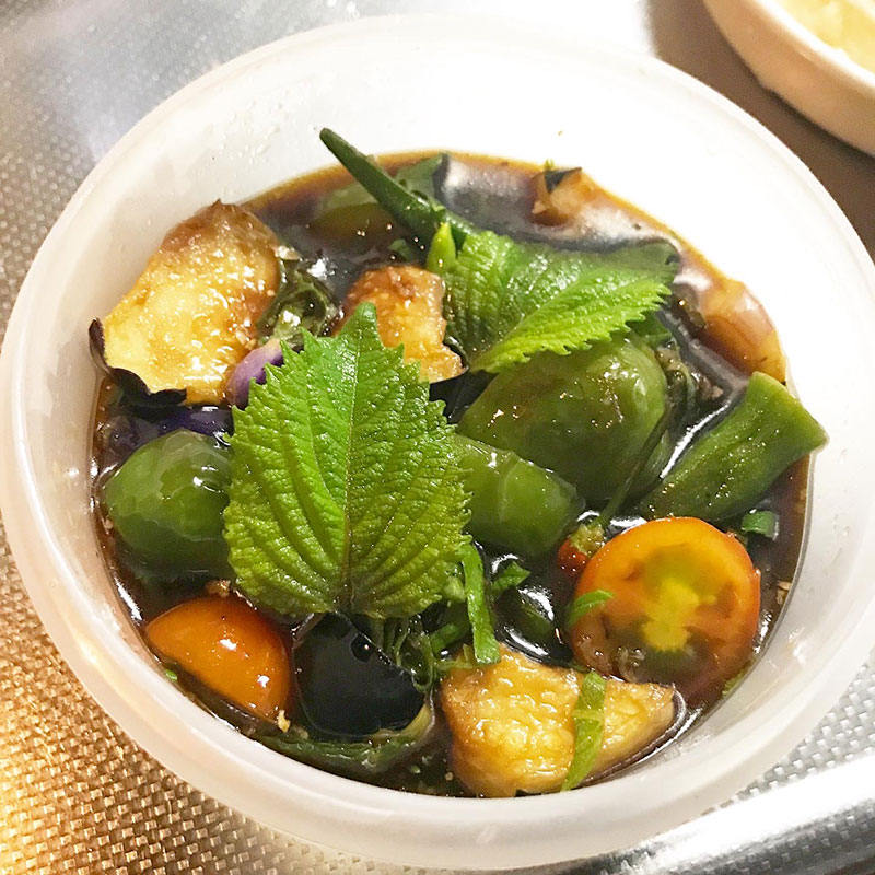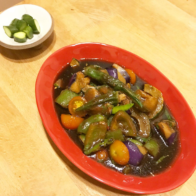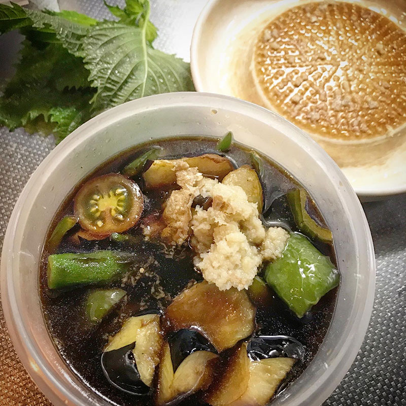 麺つゆに茄子、オクラ、ズッキーニ、ピーマン、ミニトマトを揚げたり焼いては放り込んで生姜をすって大葉も細くハサミで切り入れて。