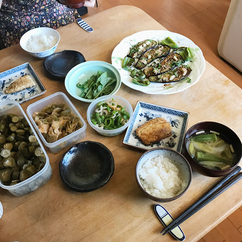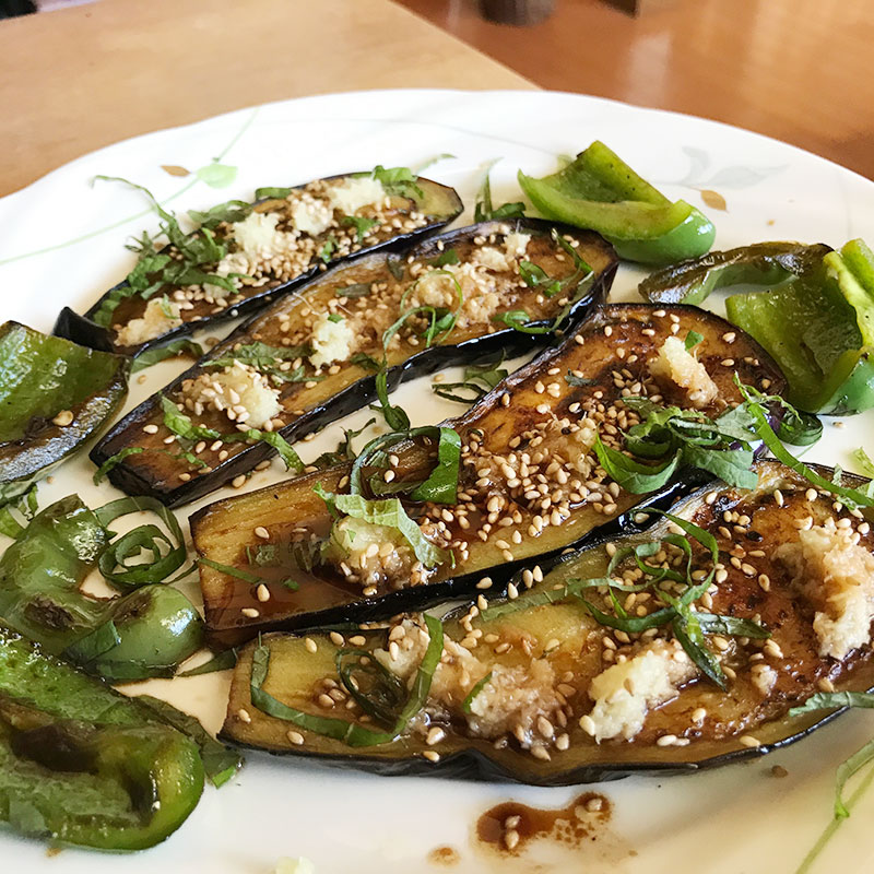 畑の茄子を焼いた。たっぷりの油を吸わせて再び吐くまで焼くととろとろになる。たっぷりの生姜と胡麻と大葉をキッチンバサミで切って。