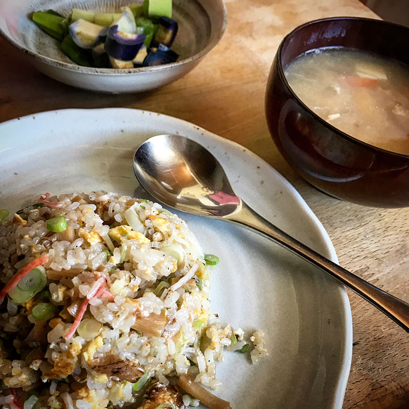 北京鍋振って炒飯の昼飯。炒飯も新米だと一味違う。それに今日はカニカマとメンマ入り。