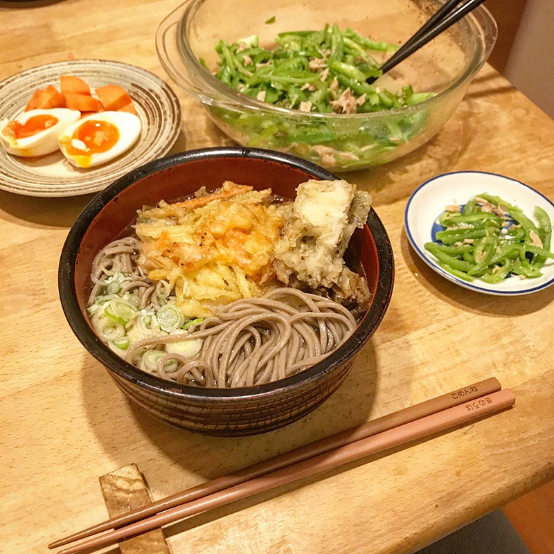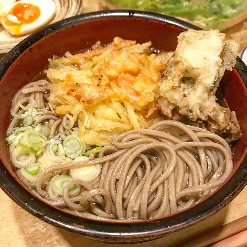 スーパーの海老のかき揚げと舞茸の天ぷら乗せて天ぷら蕎麦。
