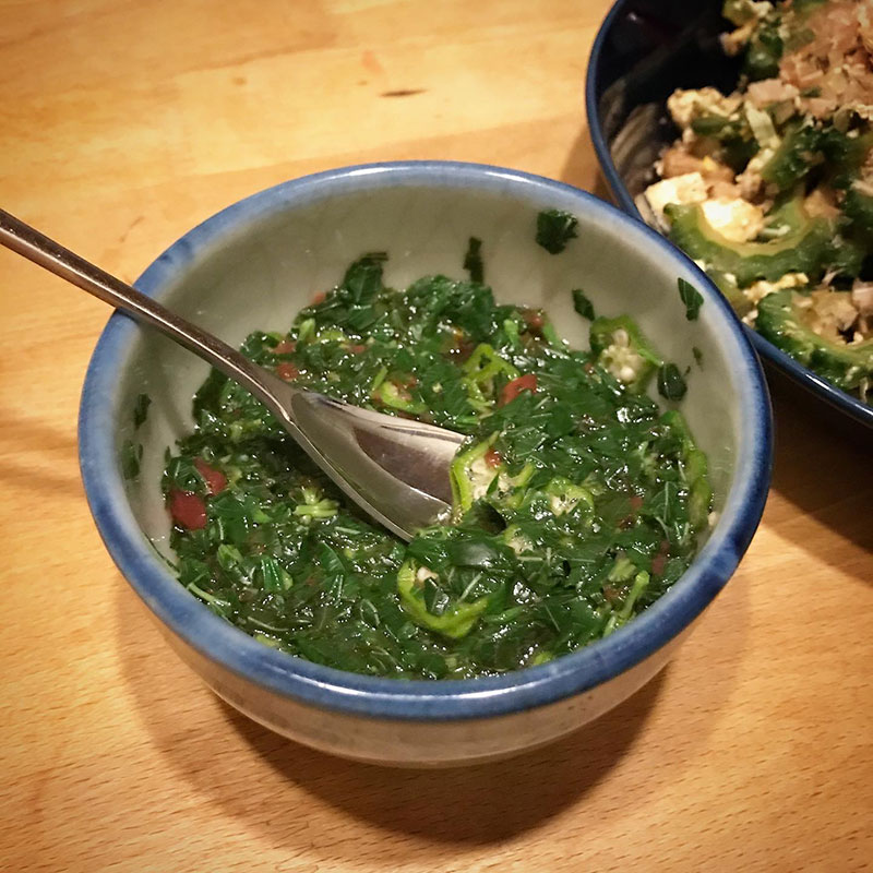 夕食前に畑からモロヘイヤ摘んでさっと茹でて梅干しと一緒に叩いて醤油。