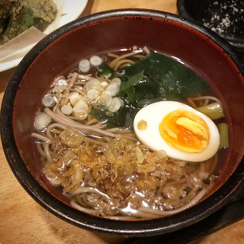 夕食に蕎麦作った。水出しの昆布と出汁パックと作り置きのかえしで作ったつゆと乾麺の羽黒蕎麦。ワカメ、茹で卵、長ネギ、天かす。