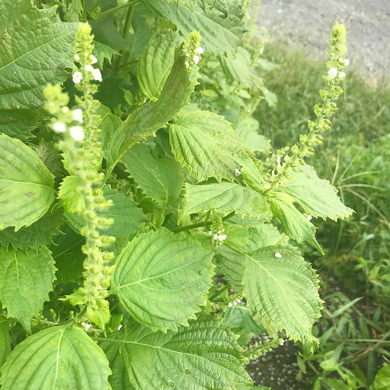 大葉の小さな白い花が落ちて