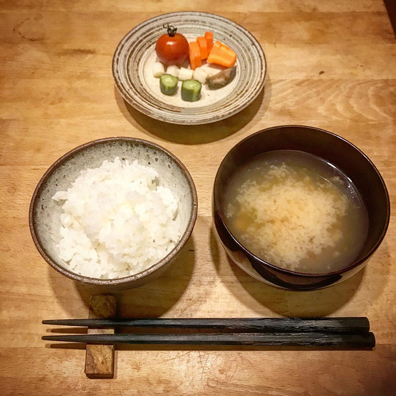 ぬか漬けと味噌汁だけで米を味わっていただきました。