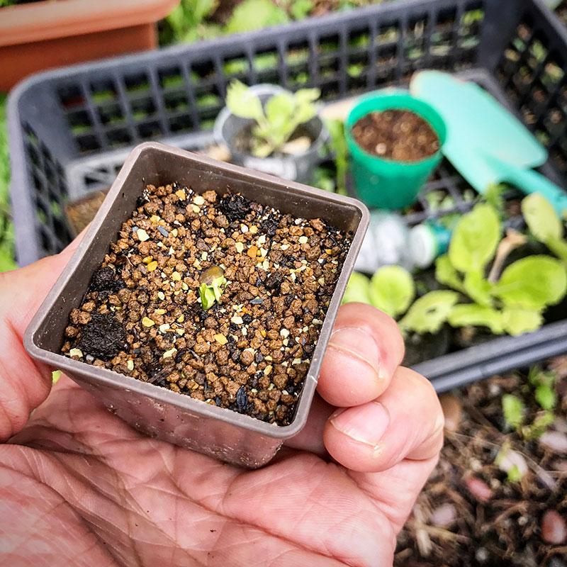 小さな四角いポットにまいた食べた後のすだちの種が発芽したみたい・嬉!!!
