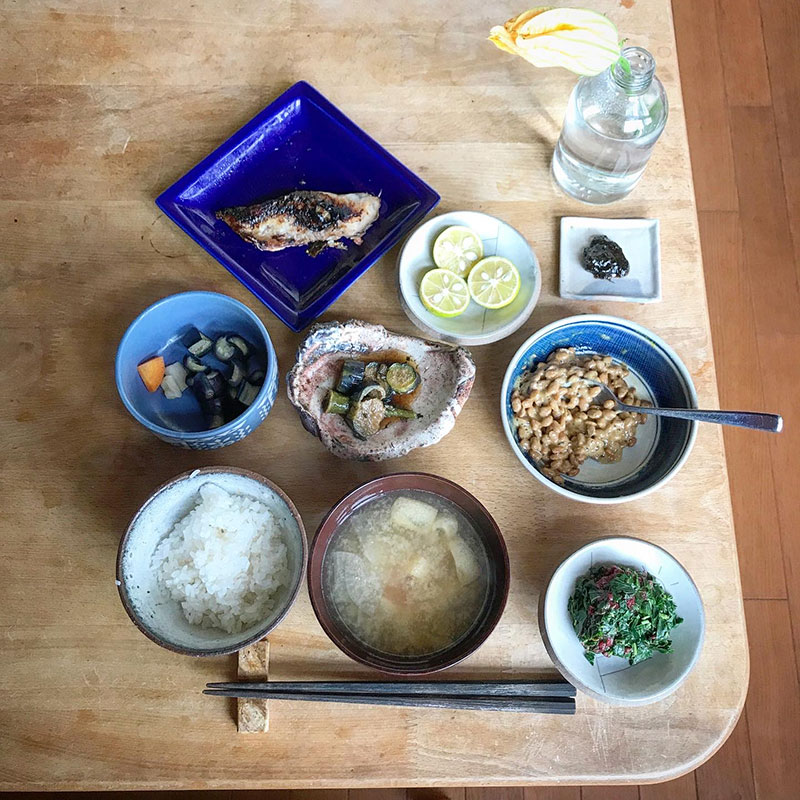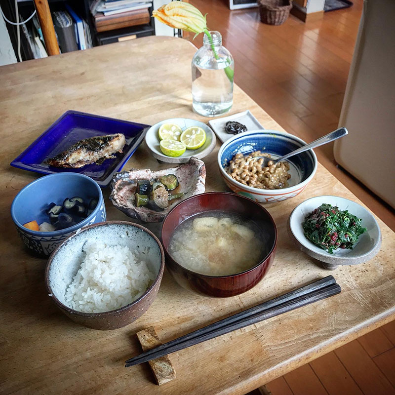 ご飯に味噌汁。焼き魚とすだち。畑のモロヘイヤを梅干しと共に細かく刻んだもの。納豆。ぬか漬け。海苔の佃煮。茄子の揚げ浸し。