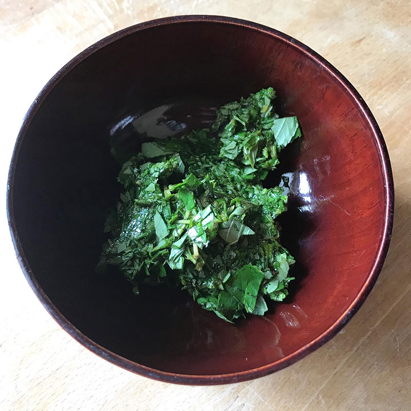 初めて和風出汁に叩いたモロヘイヤを入れてみた。悪くないけど僕はチキンスープの方が美味しいや・笑