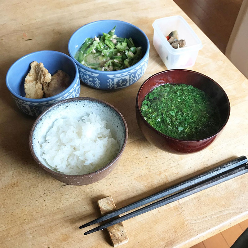 昼飯にモロヘイヤのお吸い物。いつもは原産のエジプトでよく飲まれているチキンスープをベースにしてるけど