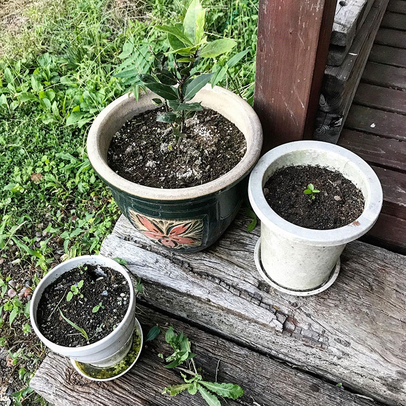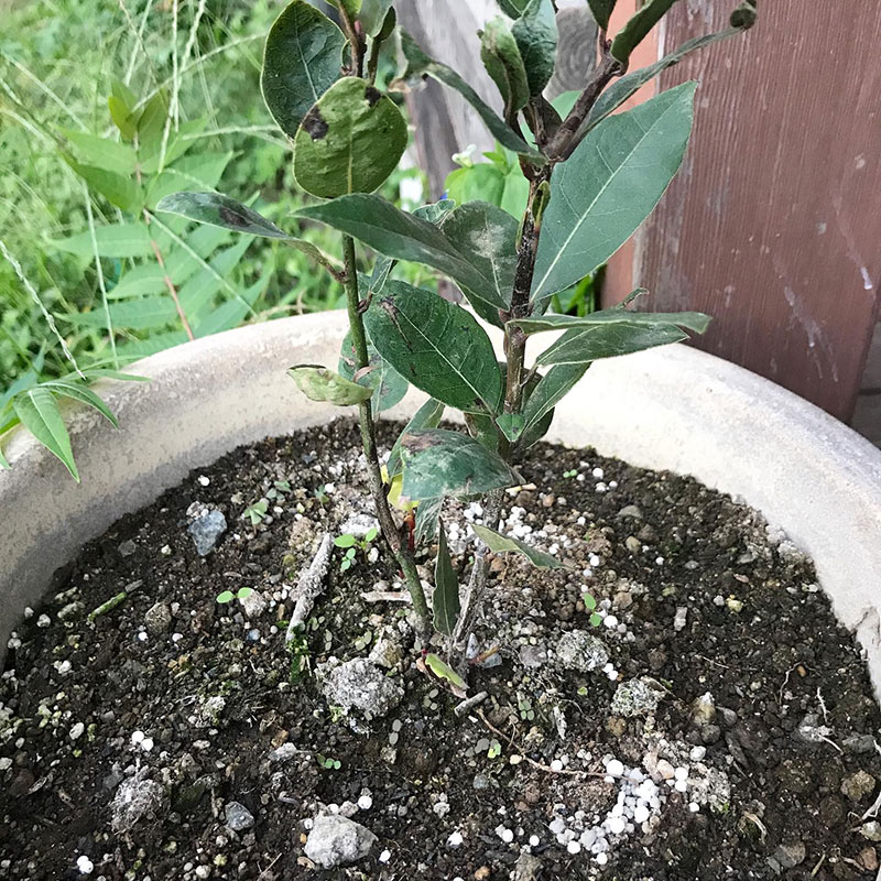 月桂樹。いちいち買わなくても料理に使えるように苗を買って先日、鉢に植えた。