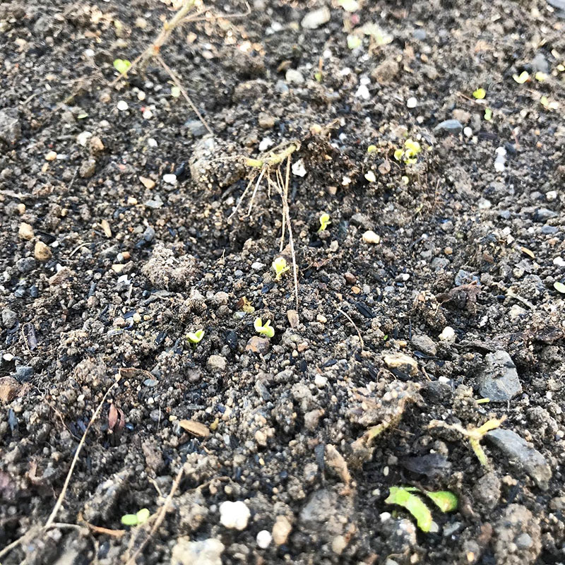 全日種まきした庭の畑で発芽した。雪菜、京菜、カブをまいたのでその中のどれか。どこに何をまいたかもう覚えてないw