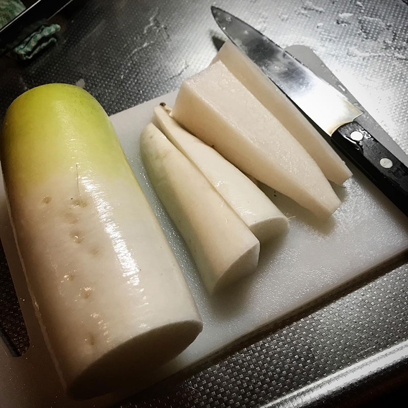 水出ししておいた昆布と共に水から鶏肉ときのこを炊いて。畑から抜いてきた大根。