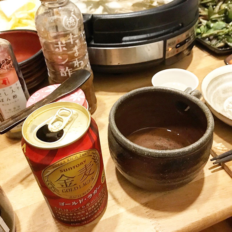 日本酒で乾杯して金麦で。今宵は〆の鍋のラーメンまでいけた。